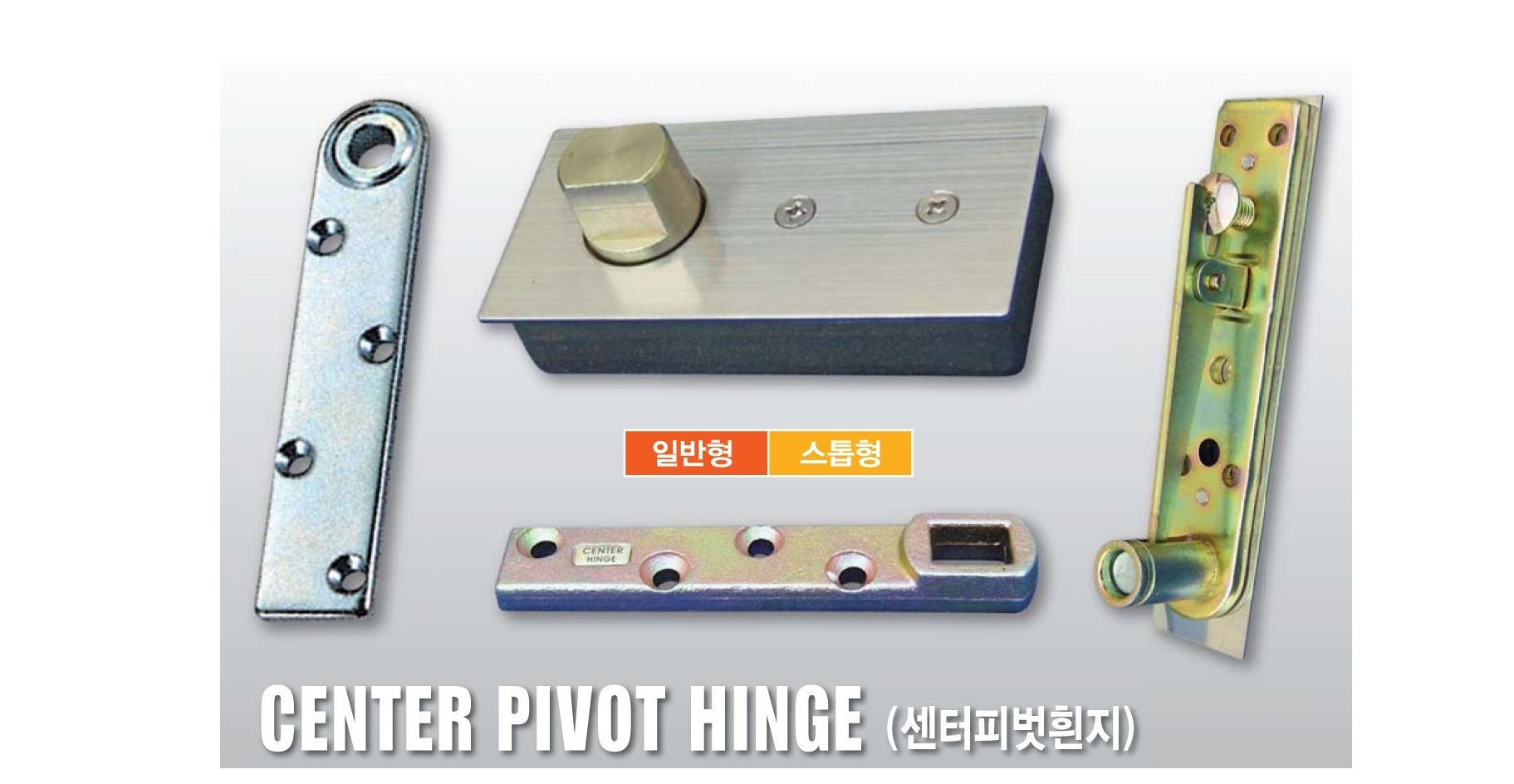 센터피벗힌지는 공회전을 하는 일반형과 스톱형 (90도~180도), 그리고 문의 중량에 따라 나누어져 선택할 수 있습니다.