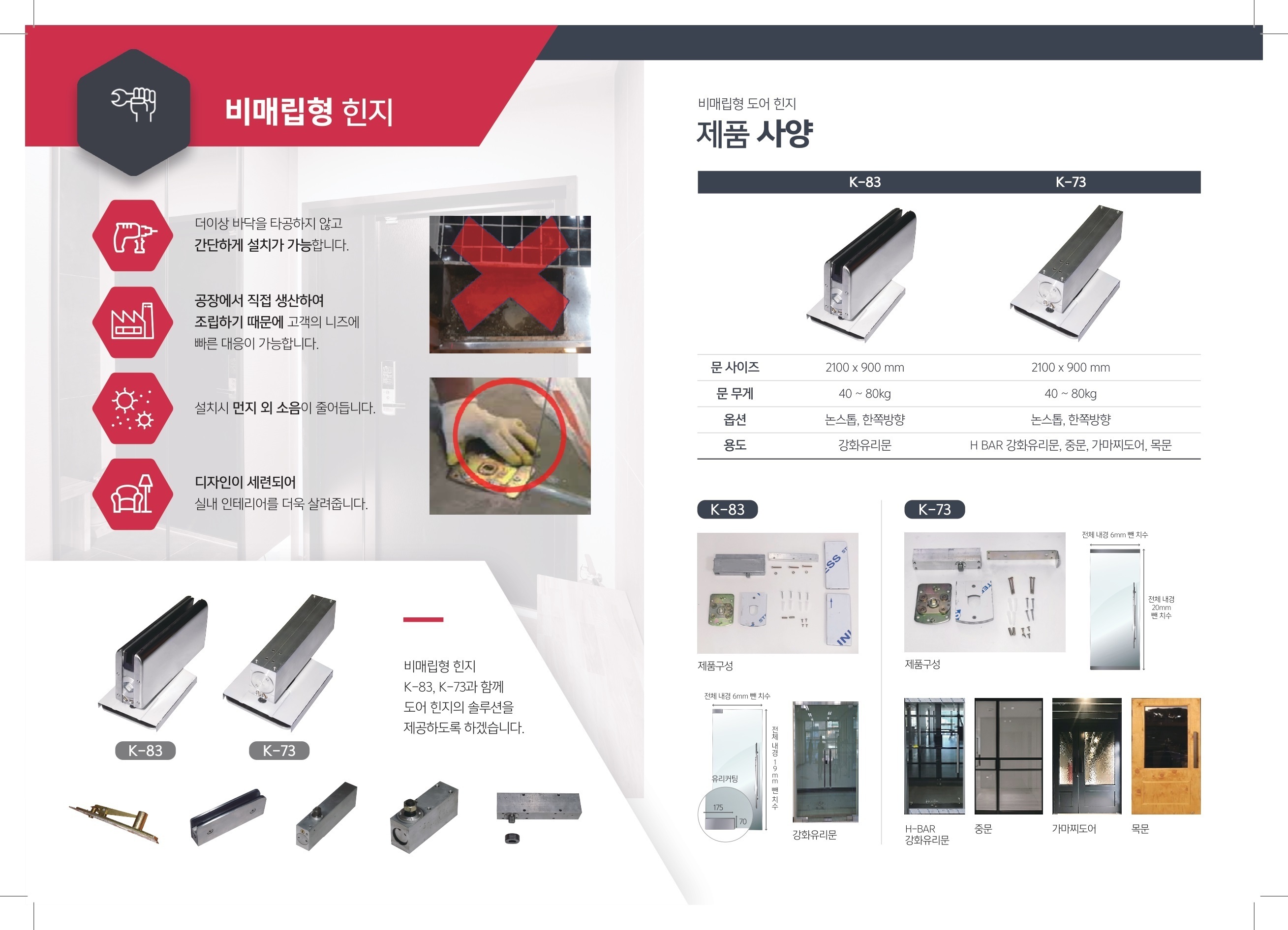 취급제품 : 피벗힌지, 옵셋피벗힌지, 센터힌지, 핀힌지, 샤워부스힌지, 콤팩트힌지, 오토힌지, 순위조절기, 도어릴리즈, 스테인리스 오도시 등